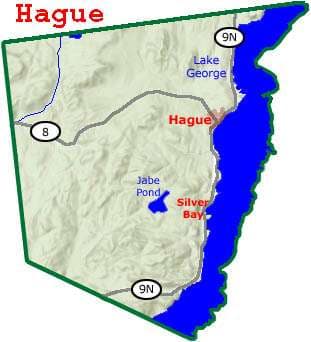 The town of Hague NY lies on the western shore of Lake George, north of Bolton and south of Essex County and Ticonderoga. Two scenic villages in the town lie along the lake: Hague to the north and Silver Bay in the middle of the town. The town is bordered on the west by the town of Horicon and on the east by Lake George.